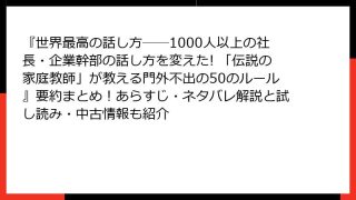 ビジネス実用 『世界最高の話し方――1000人以上の社長・企業幹部の話し方を変えた! 「伝説の家庭教師」が教える門外不出の50のルール』要約まとめ!あらすじ・ネタバレ解説と試し読み・中古情報も紹介