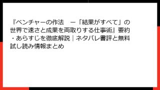 経営学・キャリア・MBA 『ベンチャーの作法 ー「結果がすべて」の世界で速さと成果を両取りする仕事術』要約・あらすじを徹底解説|ネタバレ書評と無料試し読み情報まとめ