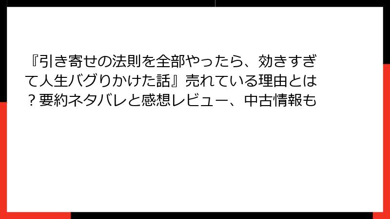 こんにちは、引き寄せ実践者の皆さん! 角由紀子さんの話題作『引き寄せの法則を全部やったら、効きすぎて人生バグりかけた話』、発売からまだ数ヶ月なのに口コミで爆発的人気ですよね。オカルト編集者のリアル実験記が気になりつつ、まずは中身をチラ見したい…そんなあなたに、Kindleをはじめとした無料試し読みの方法を詳しく解説します。さらに、中古本の在庫状況もチェック! メルカリを中心に、安く手に入れるコツをブログ風にまとめました。2025年11月時点の最新情報に基づいてお届けするので、参考にどうぞ。引き寄せの法則で「お得な出会い」を引き寄せましょう♪