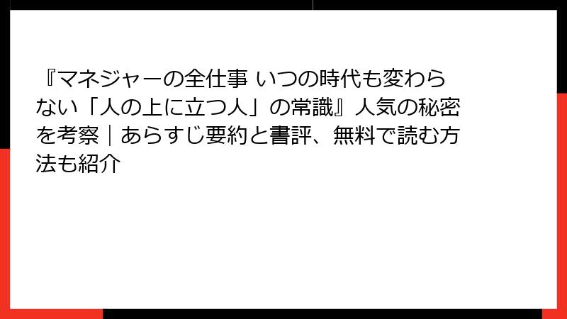 マネジメントのバイブルとして知られる『マネジャーの全仕事 いつの時代も変わらない「人の上に立つ人」の常識』。新刊価格は2,200円(税込)と手頃ですが、まずは内容をチラ見したい人や、予算を抑えたい人向けに、無料試し読みの方法と中古本の入手ルートを徹底解説します。2025年11月時点の最新情報に基づき、Kindle中心のデジタル試し読みから、メルカリなどのフリマアプリまでを網羅。あなたのリーダーシップ学習を、コストパフォーマンス高くスタートしましょう!