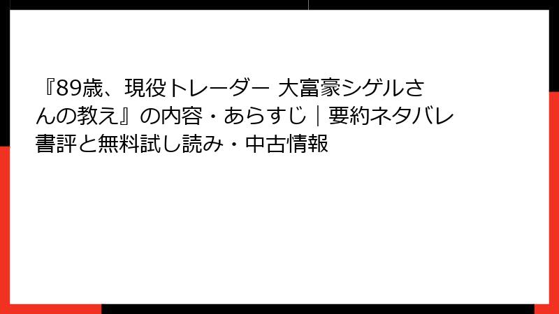 『89歳、現役トレーダー 大富豪シゲルさんの教え』を無料試し読みで味見し、中古でゲットすれば、0円スタートからシゲルさんの叡智を吸収。発売直後の今が、市場の「嵐前」のチャンスです。メルカリの出品が増えるのを待つか、Amazon中古を即ポチ。あなたもこの本をきっかけに、人生のポートフォリオをアップデート! 読了後、Xで感想シェアして「シゲル家族」入りしちゃいましょう。