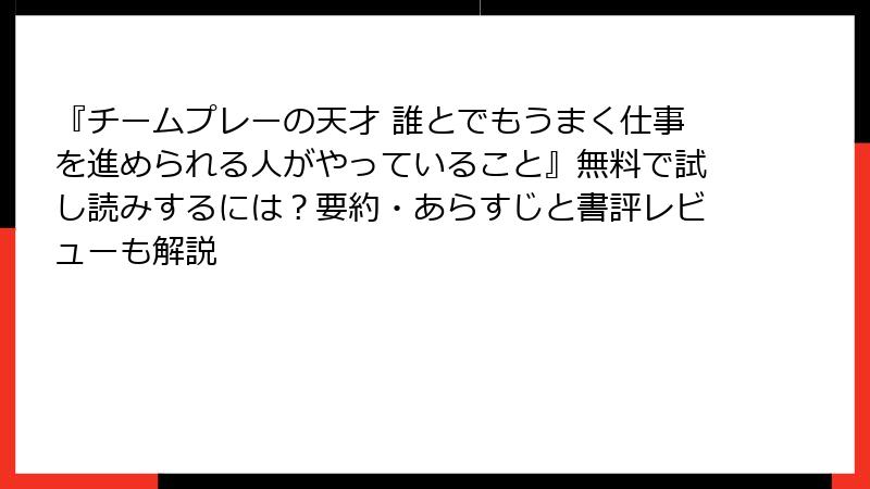 『チームプレーの天才 誰とでもうまく仕事を進められる人がやっていること』無料で試し読みするには?要約・あらすじと書評レビューも解説