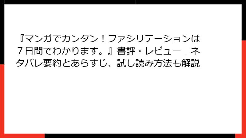 | 日経BOOKプラス | 「しない」ことの重要性(例: 介入しすぎない)を強調。漫画で体系化されたノウハウが会議の不満を解消。 | プロのファシリが認める実践性。チーム運営の極意満載。 |