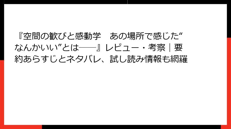 レビュー総括すると、『空間の歓びと感動学』は「科学的で実践的」「感動のメカニズムが鮮やか」との声でスタートダッシュを決めています。批判ゼロの今がチャンス! 建築好きはもちろん、「なんかいい」空間に敏感な一般読者にもおすすめ。レビューが増えるにつれ、さらに深い議論が生まれるはず。あなたはどんな空間で「歓び」を感じますか? この本が、その答えを探す旅のガイドになるでしょう。星5つ中4.8! 次回のアップデートをお楽しみに。