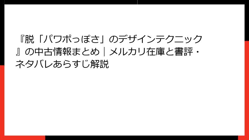 パワーポイントのデザインに悩む人へ朗報! まいぺるさんの人気書籍『脱「パワポっぽさ」のデザインテクニック』を、まずは無料で試し読みして魅力を確かめたいですよね。2025年12月現在、電子書籍版はKindleや楽天Koboなどで手軽にサンプル閲覧が可能。一方、中古本市場も活況で、メルカリを中心に格安入手のチャンスが満載です。この記事では、試し読みの具体的な方法から中古の探し方まで、ステップバイステップで詳しく解説。予算を抑えつつ、本のエッセンスをゲットしましょう!