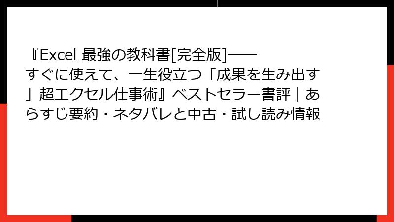 『Excel 最強の教科書[完全版]』は、無料試し読みで中身を確かめ、中古でサクッと入手すればコスパ最高。KindleのPage 1-13でハマったら、メルカリの300円台を狙って即行動! これであなたも「成果を生み出す」Excelマスターへ一歩近づけます。市場は日々変わるので、定期チェックを習慣に。読書ライフ、がんばってください!