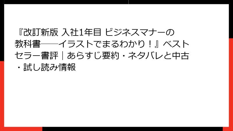 新社会人のバイブルとして人気の『改訂新版 入社1年目 ビジネスマナーの教科書――イラストでまるわかり!』。イラスト満載でマナーをサクッと学べるこの本、買う前に中身をチラ見したいですよね? 今回は、Kindleをはじめとした無料試し読みの方法を徹底解説。さらに、中古版の探し方も詳しく。2025年12月現在の状況を基に、新品が高めな今、お得に手に入れるコツをブログ風にまとめました。入社前の準備にぴったりですよ!