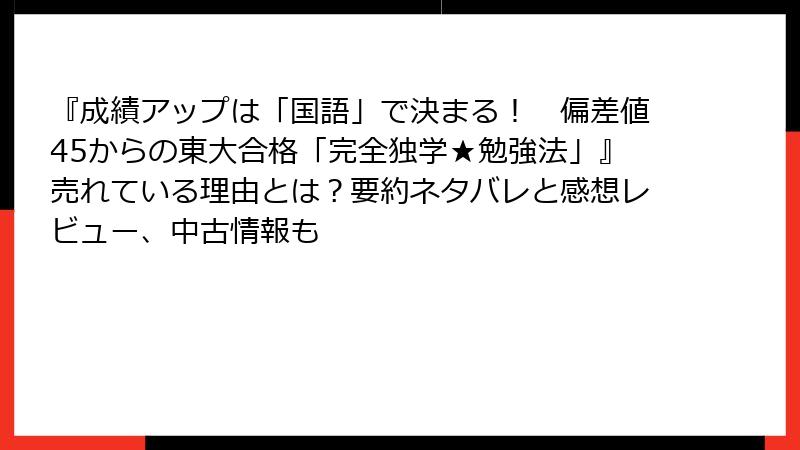 この本は、偏差値45の著者が東大合格を掴んだ「完全独学★勉強法」のバイブル。国語を軸に全科目を底上げする発想は、受験生はもちろん、ビジネスパーソンや親御さんにも通用します。ネタバレを明かしましたが、読む価値は格段に高いはず。さあ、今日から読書を1冊増やしてみては? あなたの「大逆転」が待ってるかも!