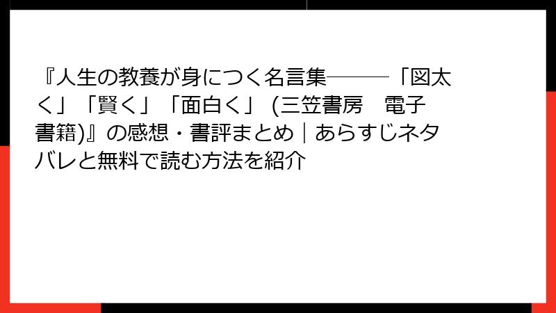 出口治明氏の『人生の教養が身につく名言集―――「図太く」「賢く」「面白く」』は、出版以来、読書家や自己啓発を求める人々から熱い支持を集めています。1万冊以上の読書経験を持つ著者が、古今東西の名言に自身のエピソードを織り交ぜ、人生の指針を提供するこの一冊。Amazonでの評価は4.3/5(2,000件超)、ブクログでは3.75/5(100件以上)と、全体的に高評価です。しかし、すべての本が万人に刺さるわけではなく、一部で「ついていけない」「目新しさがない」といった声も。今回は、レビューや書評、X(旧Twitter)での感想を深掘りし、ポジティブな魅力からネガティブな批判まで、バランスよく探ります。ネタバレなしで本質を捉えつつ、読者の生の声を基に考察を加えていきましょう。