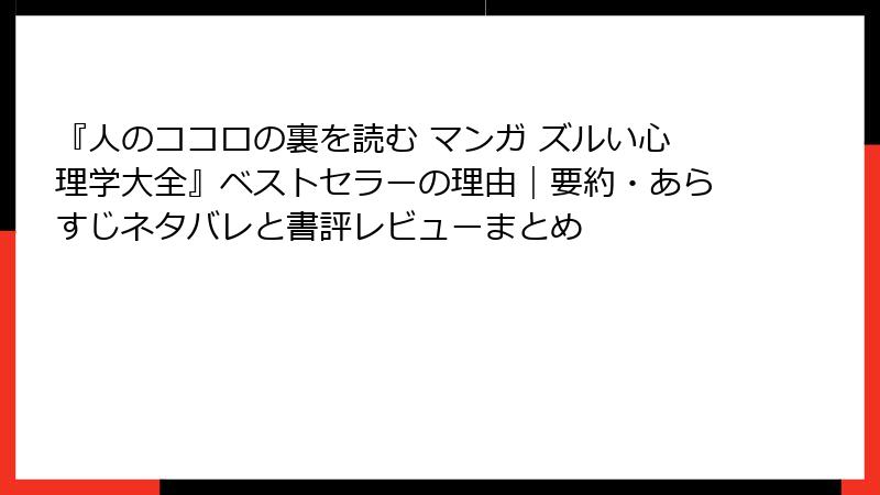 『人のココロの裏を読む マンガ ズルい心理学大全』は、ただの知識本じゃなく、生活を変える指南書。ネタバレをすべて明かしましたが、マンガのユーモアと図解の視覚効果が、理論を記憶に定着させます。レビューでも「読み応えあり」「日常で即実践可能」と高評価。心理学初心者から上級者まで、幅広く楽しめます。