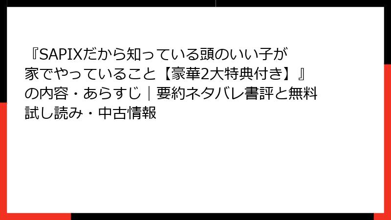 こんにちは、子育て本ハンターの皆さん! 前回のレビュー深掘りで『SAPIXだから知っている頭のいい子が家でやっていること【豪華2大特典付き】』の魅力にハマった方、続いて実践編をお届けします。佐藤智さんのこのベストセラー(7万部突破!)、新品価格は1,500円前後ですが、賢く手に入れるなら「無料試し読み」と「中古市場」が鉄板。Kindle中心に、楽天Koboやブックオフまで、2025年12月現在の最新情報をブログ風に詳しくまとめます。試し読みで内容をチラ見して、中古で安くゲットする流れがおすすめですよ。ネタバレなしで、親子で実践したくなるはず!