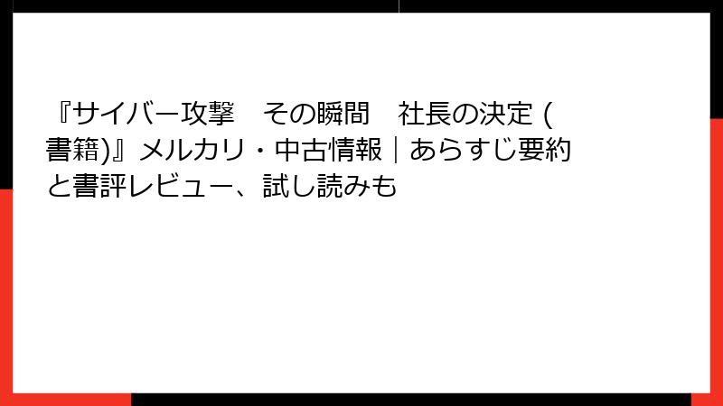『サイバー攻撃 その瞬間 社長の決定』は内容のインパクトが強いため、まずはKindleの無料試し読みで冒頭部分を体験することを強くおすすめします。攻撃発生の緊迫感や社長の決断シーンだけでも十分に価値を感じられるはずです。そこで気に入ったら新刊購入、予算を抑えたい場合はメルカリなどの中古市場をチェックする、という流れが現実的です。2025年12月現在、中古は確実に流通し始めているので、タイミング次第でお得に手に入る可能性は十分にあります。