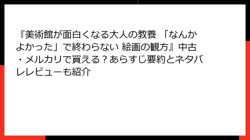 - メルカリの深掘り: 検索で「美術館が面白くなる大人の教養 中古」と入力すると、即ヒット。出品例として、¥1,911のやや傷あり版や¥2,156のほぼ新品級が目立つ。2025年9-10月頃の出品も残り、値下げ待ちでさらにお得に。コメントで状態確認を忘れずに。