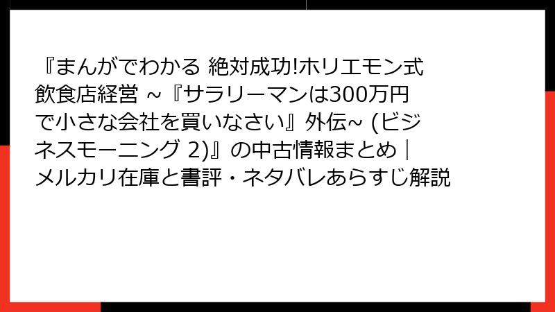 飲食店を開業したいけど、失敗のリスクが怖い…そんな悩みを抱える人必見!堀江貴文監修の漫画ビジネス書『まんがでわかる 絶対成功!ホリエモン式飲食店経営』は、初心者が陥りやすい罠をユーモラスに描きながら、数字に基づく実践的な経営術を伝授します。この本は、前作『サラリーマンは300万円で小さな会社を買いなさい』の外伝として、低コストで店を再生するノウハウを飲食業界に特化。漫画形式なので、1時間でサクッと読めて、活字が苦手な人にもぴったりです。今回は、ネタバレ満載でストーリーと教訓を深掘り。あなたの夢を現実にするヒントが満載ですよ!