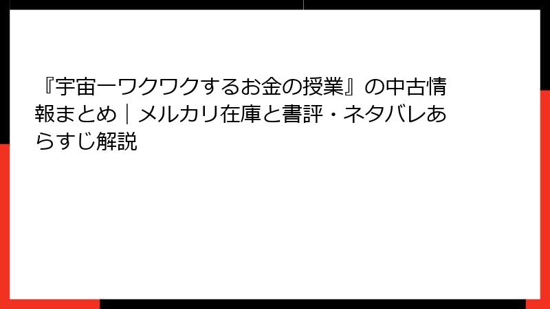 こんにちは、お得情報ハンターの皆さん! 前回までのレビューやあらすじで気になった『宇宙一ワクワクするお金の授業』ですが、まずはお試しで読んでみたいですよね? 今回は、Kindleをはじめとした電子書籍の無料試し読み方法を徹底解説。さらに、中古本の宝庫であるメルカリをはじめ、さまざまな入手先をチェック。2025年12月現在の最新状況を基に、価格帯や状態の傾向もお伝えします。新品が高め(定価1,540円)な本だけに、賢く手に入れるコツが満載です。電子派? 中古派? どっちもカバーするので、参考にどうぞ!
