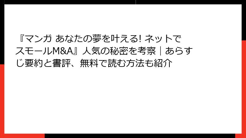 『マンガ あなたの夢を叶える! ネットでスモールM&A』人気の秘密を考察|あらすじ要約と書評、無料で読む方法も紹介