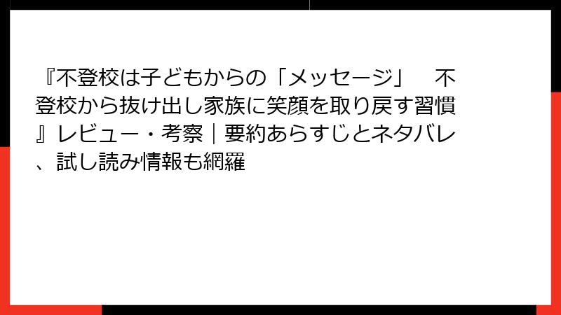 - Rakuten書店関連レビュー(類似本含む): 「不登校だった本人のメッセージや、親の『しくじり』まで込みで解説。子どもへの関わり方、親のあり方が分かります。疲れた心に寄り添う一冊で、すぐに習慣化できました。」