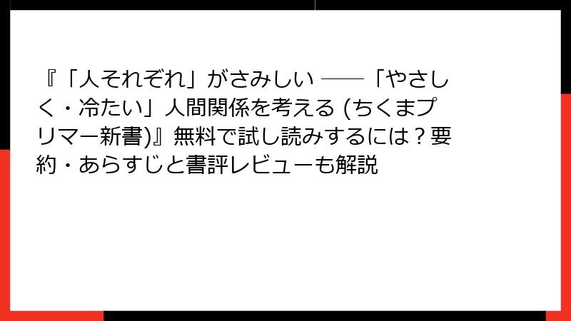 石田光規氏の名著『「人それぞれ」がさみしい ――「やさしく・冷たい」人間関係を考える』。現代の人間関係のモヤモヤを鋭く突く一冊ですが、まずは無料で試し読みして気軽に触れてみませんか? また、中古本ならお手頃価格で手に入るかも。2025年12月現在、電子書籍の試し読みオプションは充実しており、中古市場も活況です。本記事では、Kindleをはじめとした無料試し読みの方法を詳しく解説し、中古本の入手ルート(メルカリやブックオフなど)を徹底調査。ブログ風に読みやすくまとめました。あなたの読書ライフをサポートします!