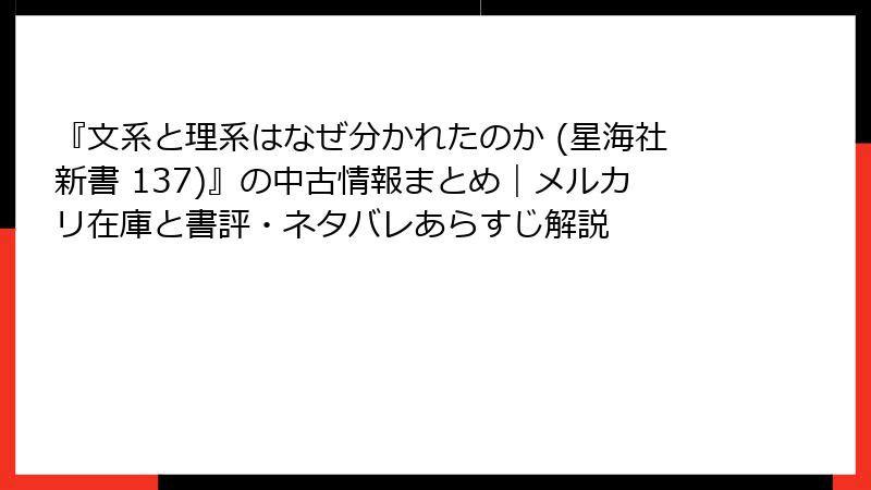 『文系と理系はなぜ分かれたのか』は、無料試し読みで「なぜ?」の扉を開き、中古で手軽に深掘りできる逸品。メルカリの¥400台は今すぐ狙い目、Kindleサンプルは即行動を。こうしたお得ルートを知れば、知的投資が楽しくなるはず。あなたはどっち派? まずはサンプルから、文理の歴史に飛び込んでみては。
