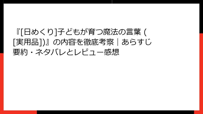 ドロシー・ロー・ノルトの名著『[日めくり]子どもが育つ魔法の言葉』は、子育てのバイブルとして長年愛されてきました。日めくり形式のユニークな実用品として、毎日のルーチンに溶け込み、親の言葉が子どもの未来を形作るというシンプルなメッセージが、多くの心を掴んでいます。今回は、Amazon、楽天、ブクログなどのレビューサイトやSNSの声を集め、ポジティブな感想から考察までを深掘り。意外にも、批判的な意見はほとんど見当たらず、その理由も探ってみました。子育てに悩む親御さん必見の、リアルな読者像をお届けします。
