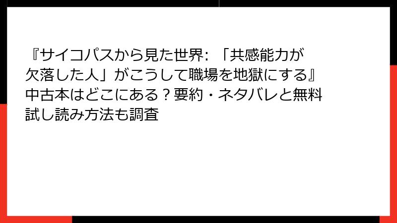 『サイコパスから見た世界』は、試し読みでその「地獄のリアル」を無料で味わい、中古市場の豊かさで手軽に全編ゲット可能。メルカリの多様な出品が特に熱く、Amazonの安定感も心強い。2025年末の今、職場ストレス解消にぴったりの一冊。あなたも今日からサイコパスを見抜く目を養ってみては? 読後、きっと世界が変わります。