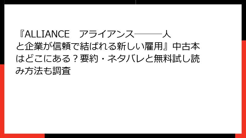 信頼ベースの雇用モデルを提唱する名著『ALLIANCE アライアンス―――人と企業が信頼で結ばれる新しい雇用』。新品価格が2000円前後する中、2025年12月現在、無料で試し読みできるチャンスが満載です。さらに、中古市場では数百円から手に入る掘り出し物がゴロゴロ。この記事では、KindleやKoboなどの電子書籍プラットフォームでの試し読み術から、メルカリをはじめとした中古本の宝庫まで、ステップバイステップで詳しく解説。キャリア本を探すあなたに、即実践できるお得情報をブログ風にまとめました。まずはサンプルで魅力を確かめて、中古でサクッと購入を!