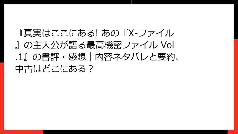 前回のあらすじ・ネタバレで興奮冷めやらぬ『真実はここにある! あの『X-ファイル』の主人公が語る最高機密ファイル Vol.1』。今回は、読者からの生の声に耳を傾けてみましょう。Amazonや読書メーター、ブログ、SNSなどで寄せられたレビューを徹底調査! 全体的に高評価(平均4.5星前後)ながら、熱狂的なファンと冷めた懐疑派の声が交錯。刺激的すぎて「おかしい」「信じがたい」との批判も目立ちます。ネタバレなしで、ポジティブ・ネガティブをバランスよくまとめました。あなたはどっち派?