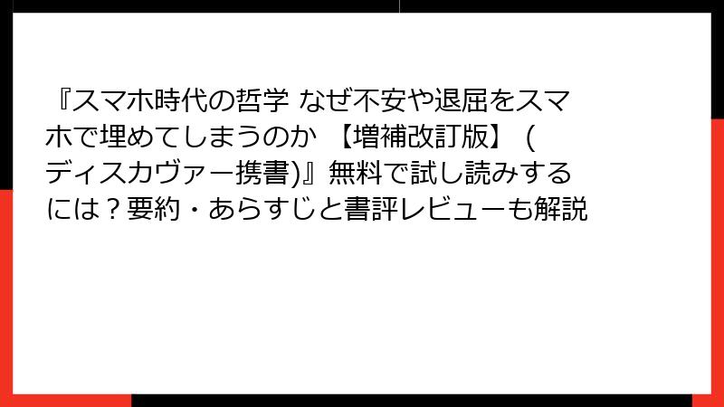 谷川嘉浩著の『スマホ時代の哲学 なぜ不安や退屈をスマホで埋めてしまうのか 【増補改訂版】』は、スマホ依存の現代を鋭く分析した一冊。発売から人気を博し、電子書籍版も充実していますが、まずは無料で試し読みして内容を確かめたいですよね。また、定価1540円(税込)の新品が高く感じるなら、中古本を探すのも賢い選択。この記事では、Kindleをはじめとした試し読みの具体的な方法と、中古版の主な入手先(メルカリ含む)を詳しくガイドします。2025年12月現在の情報に基づき、読者の皆さんがスムーズにアクセスできるようにまとめました。哲学の旅を、低コストでスタートしましょう!