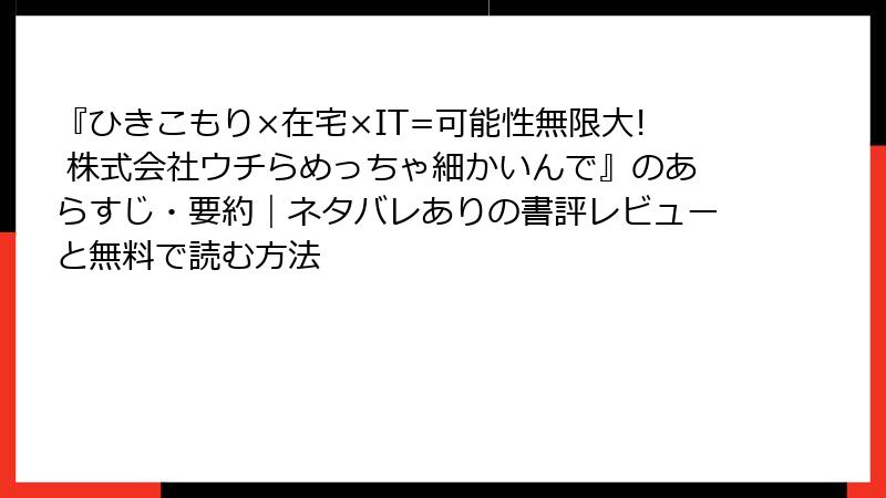 こんにちは、読書好きのブロガーです。今日は、『ひきこもり×在宅×IT=可能性無限大! 株式会社ウチらめっちゃ細かいんで』を深掘り。ひきこもり支援の革新的な視点が光るこの本、どんな人にオススメか? そして、著者のバックグラウンドを詳しく解説します。2025年現在、テレワークの定着でますます注目される一冊。ひきこもり当事者からビジネスパーソンまで、幅広い読者像を挙げつつ、理由を紐解いていきましょう。レビューや内容から見える「読む価値」を、ネタバレなしでまとめました!