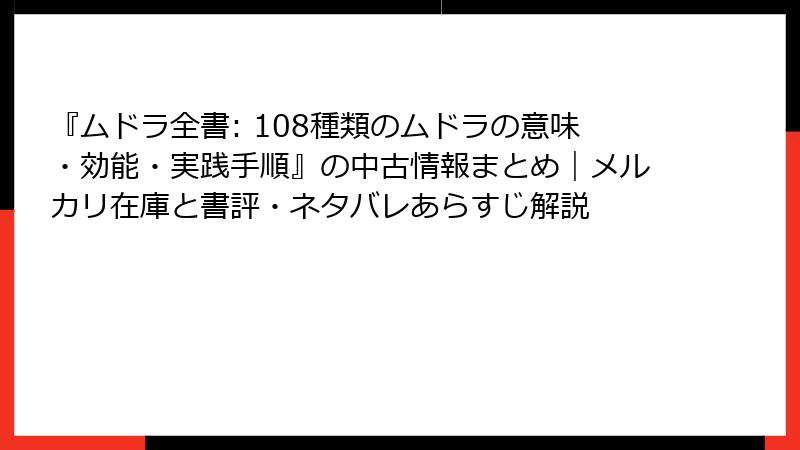 - 到着後アクション: 試し読みで気になったムドラを実践。満足度低ければ返品ポリシー活用(メルカリはノークレーム推奨)。