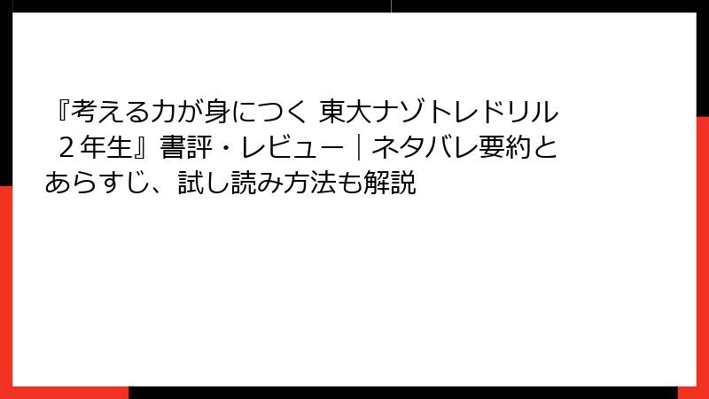 こんにちは、子育てブロガーのみゆきです。今日は、前回紹介した『考える力が身につく 東大ナゾトレドリル 2年生』のレビューや感想を、ネット上の声を中心に深掘り! Amazonや各種書評サイト、親御さんのリアルなつぶやきを調べてみました。全体的に高評価ですが、もちろん「難しい!」という声もちらほら。ネタバレなしで、ポジティブから批判までバランスよくまとめます。親子で読む本だからこそ、こうした声が参考になりますよね。さっそくチェックしていきましょう!