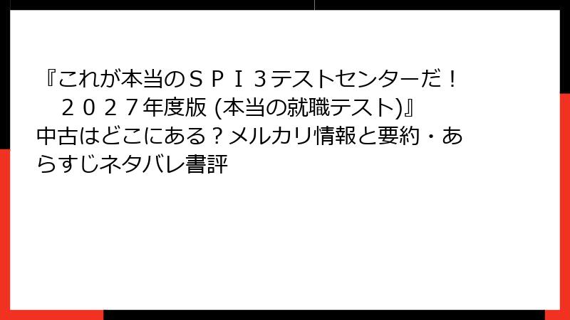- メルカリの検索Tips: 「これが本当のSPI3テストセンターだ 2027年度版」で検索すると20件以上ヒット。フィルターで「未使用」を選べばクリーン品優先。取引完了率95%以上で安心。