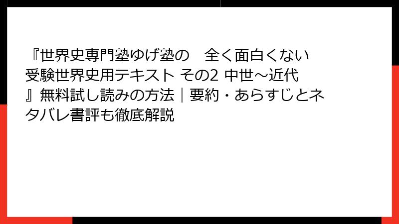無料試し読みはKindle一択で即スタート可能。中古は希少ですが、フリマのゆげ塾ブームに乗ればお宝ゲット。タイトルが「面白くない」だけに、試せばその論理の鋭さに驚くはず。この一冊で中世〜近代の構造を掴めば、受験が一気に楽しく(?)なります。次回はシリーズ全巻レビュー! 世界史の旅、続けてくださいね。