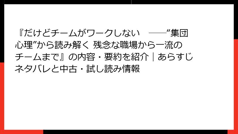 『だけどチームがワークしない ――“集団心理”から読み解く 残念な職場から一流のチームまで』の内容・要約を紹介|あらすじネタバレと中古・試し読み情報