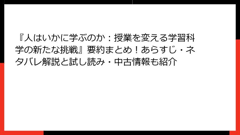 教育科学の金字塔ともいえる一冊、『人はいかに学ぶのか:授業を変える学習科学の新たな挑戦』。2024年4月の刊行から間もなく1年半、学習のメカニズムを科学的に解き明かす内容が話題を呼んでいます。でも、新刊価格は高め(定価3,300円前後)。そこで、まずは無料で試し読みして魅力を確かめたいですよね? さらに、中古本を探せばお得にゲット可能。Amazon Kindleから楽天Kobo、メルカリまで、最新の入手ルートを徹底調査しました。この記事で、あなたの「学びの投資」を最小限に抑えましょう。