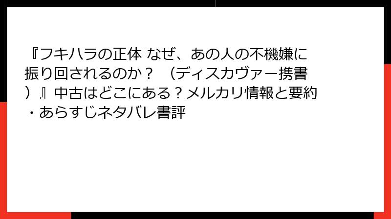 『フキハラの正体』を無料試し読みで味見し、中古市場で手頃に確保する――これで不機嫌の渦から脱出の第一歩。Kindleのサンプルで科学的な魅力にハマったら、メルカリの¥500台出品をチェック! 中古は状態確認を怠らず、満足度の高い1冊を。あなた的不機嫌ハラスメント対策、今日からスタートです。読後、感想をシェアしてね♪