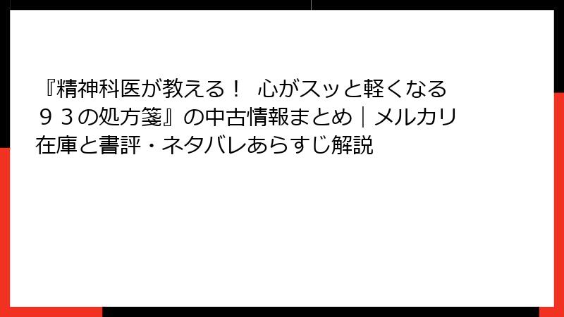 精神科医・樺沢紫苑さんの『精神科医が教える!心がスッと軽くなる93の処方箋』は、2025年6月の発売以来、心のメンテナンス本として人気を博しています。発売から半年経った今、Kindleなどの電子書籍で無料試し読みが手軽に楽しめ、中古市場でもお手頃価格で手に入るようになりました。今回は、試し読みの具体的な方法と、中古版の流通状況を徹底調査。メルカリの出品例も含め、予算に優しい入手ルートを詳しく解説します。心が重い日に、まずはサンプルから「スッと」軽くなるヒントを掴んでみませんか?