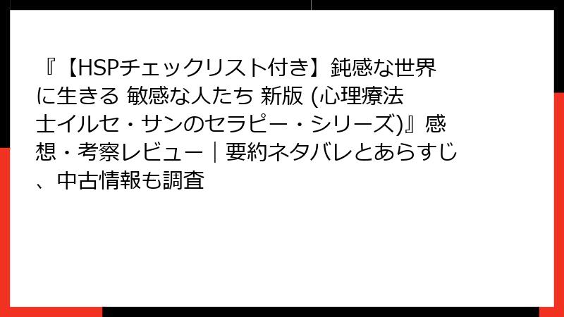 【HSPチェックリスト付き】鈍感な世界に生きる 敏感な人たち 新版:無料試し読みから中古探しまで、敏感な心に優しい入手術