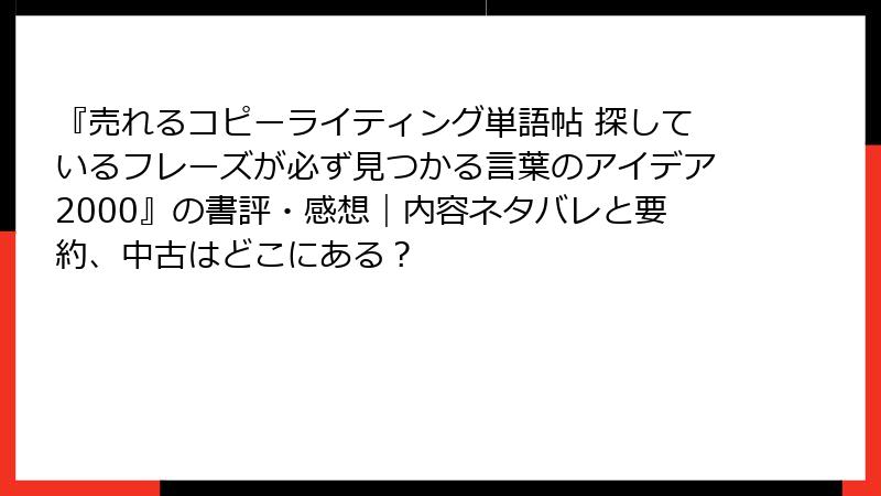 レビューをざっと見渡すと、9割以上が星4〜5つ。最大の魅力は「すぐに使える」点で、理論偏重の本が多い中、この本は「単語帖」形式でパラパラめくれる手軽さが光ります。Xでは「コピーライター必読書リスト」に頻出するほど、プロからも愛用されています。一方で、増補改訂版(2400フレーズ版)の登場で「さらに進化した」との声も。全体として、SNS時代に欠かせない「心を動かす言葉」を求める人々に刺さっているようです。