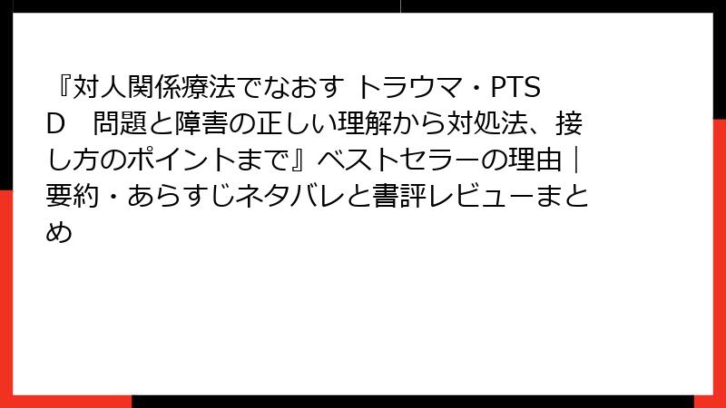 | 支援者のための実践性 | 「トラウマの本質を分り易く深く学べると共に、身近な人がトラウマを抱える方が実例を参考に関係性療法を活かした話法や付き合い方を学べる良書です。以下に勉強になった点:①対人関係の重要性、②役割変化の捉え方、③境界設定のコツ。」 | 具体的なリスト形式のアドバイスが即戦力。家族向けのガイドとして最適。 |