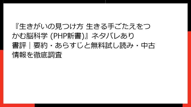 2025年7月29日発売のPHP新書『生きがいの見つけ方 生きる手ごたえをつかむ脳科学』。脳科学の視点から「生きがい」を日常の行動で掴むヒントが満載の本書ですが、まずは無料で中身をチラ見したいですよね? また、定価1,100円(税込)の新刊が高めなら、中古で狙うのもアリ。出版から約5ヶ月経過した今(2025年12月15日時点)、試し読みのチャンスと中古市場の動向を徹底調査。Kindleユーザー向けからメルカリの掘り出し物まで、詳しくガイドします。あなたの手ごたえある読書スタートをサポート!