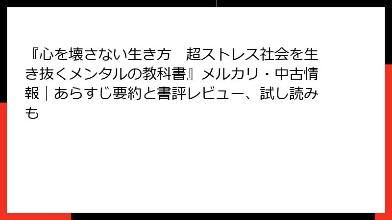 超ストレス社会で心のケアを学ぶ一冊、『心を壊さない生き方 超ストレス社会を生き抜くメンタルの教科書』。この本は、科学的根拠を基に睡眠・食事・運動でメンタルを強化する実践ガイドです。出版から5年経った2025年現在も、ビジネスパーソンや若手世代に支持されています。今回は、この本をおすすめする読者像とその理由を詳しく解説しつつ、著者たちの背景を深掘り。あなたがストレスを感じているなら、この記事が本選びのヒントになるはず。メンタルヘルスの「教科書」として、なぜ特定の層に刺さるのか? 読み進めながら、自分のライフスタイルと照らし合わせてみてください。