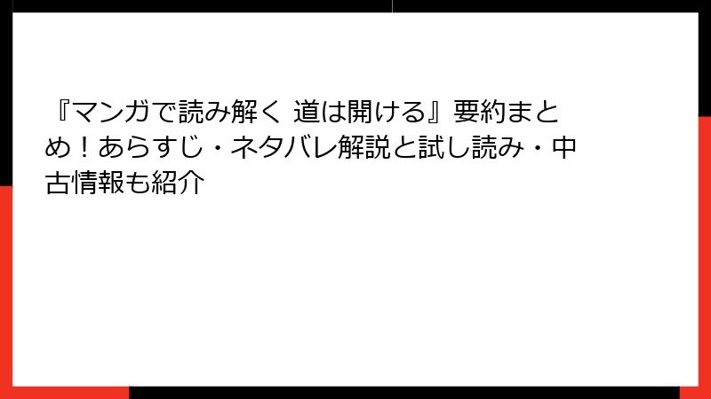 | メルカリ | 20件以上。状態良好のものが多数。 | ¥600〜¥700(例: ¥689の美品) | 個人間取引で交渉可能。匿名配送対応で安心。マンガ版のセット(人を動かすと同梱)も出品あり。検索キーワード「マンガで読み解く 道は開ける」でヒット。 |