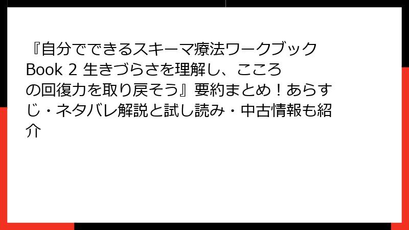 『自分でできるスキーマ療法ワークブック Book 2 生きづらさを理解し、こころの回復力を取り戻そう』要約まとめ!あらすじ・ネタバレ解説と試し読み・中古情報も紹介