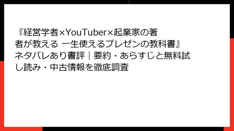 中川功一氏の『経営学者×YouTuber×起業家の著者が教える 一生使えるプレゼンの教科書』は、発売から約2年が経過した現在も人気のビジネス書です。購入前に内容を確認したい人向けに、電子書籍での無料試し読みが複数のプラットフォームで利用可能。一方、中古市場ではフリマアプリや中古書店で流通しており、手頃な価格で入手できます。ここでは、無料試し読みの具体的な方法と、中古版の主な入手先・価格状況を詳しくまとめます。情報は2025年12月現在のものです(在庫・価格は変動します)。