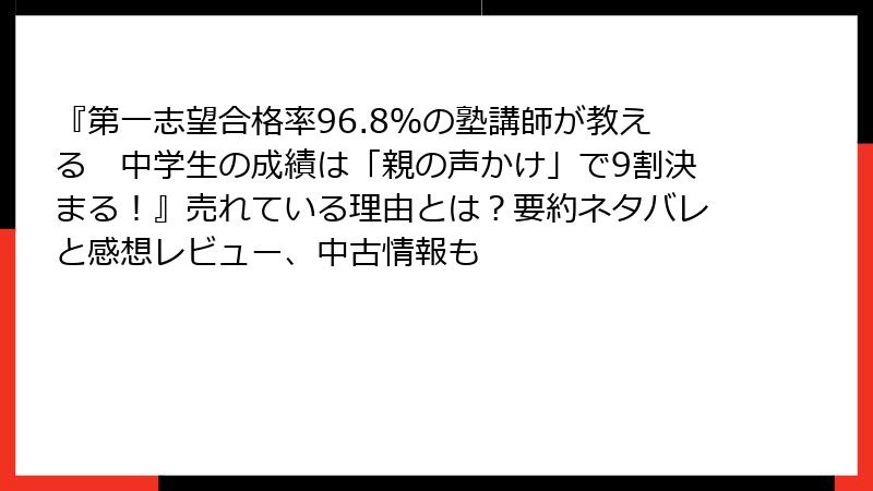 『第一志望合格率96.8%の塾講師が教える 中学生の成績は「親の声かけ」で9割決まる!』売れている理由とは?要約ネタバレと感想レビュー、中古情報も