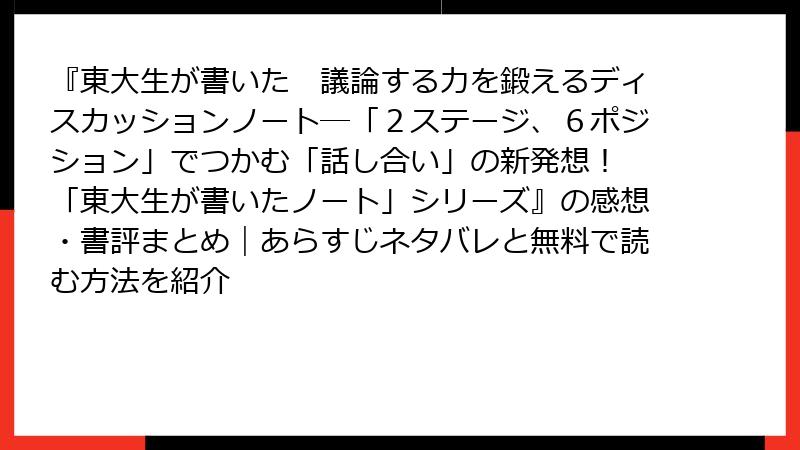 『東大生が書いた 議論する力を鍛えるディスカッションノート―「2ステージ、6ポジション」でつかむ「話し合い」の新発想! 「東大生が書いたノート」シリーズ』の感想・書評まとめ|あらすじネタバレと無料で読む方法を紹介