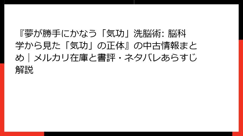 最終的に著者は、気功をマスターすれば「夢が勝手にかなう」状態になり、努力せずに目標が実現すると結論づけます。伝統気功の秘伝を脳科学で解明した画期的な一冊ですが、著者の極端な主張(がんが消える、量子テレパシーなど)から「トンデモ本」と感じる読者もいる一方、実践して効果を実感したという声も多くあります。