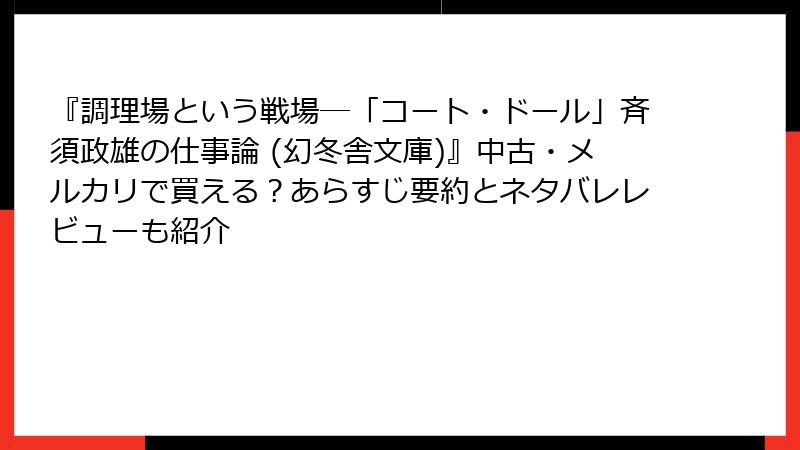 中古版は状態により価格差が出ますが、斉須政雄の熱い仕事論を楽しむには十分。まずは試し読みで内容を確かめ、気に入ったら中古を探すのがおすすめです。