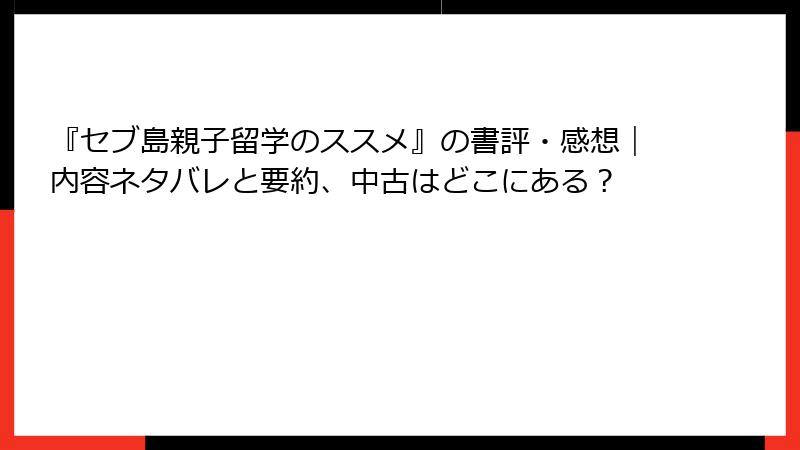 Amazon以外のブログや書評サイトでの言及は非常に少なく、専門的な書評はほとんど見当たりません。親子留学関連のまとめサイトで「セブ島親子留学の体験記としておすすめ」と紹介される程度です。考察として挙げられるのは: